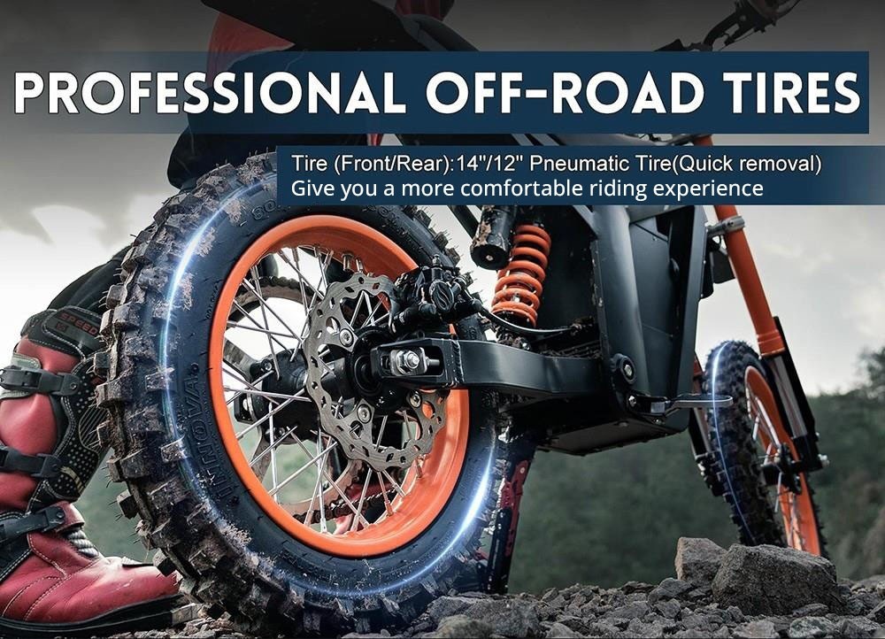 With a 14-inch front tire and a 12-inch rear tire, this electric bike offers unparalleled traction and control, ensuring you can tackle any terrain with confidence. Say goodbye to limitations and embrace adventurous rides.